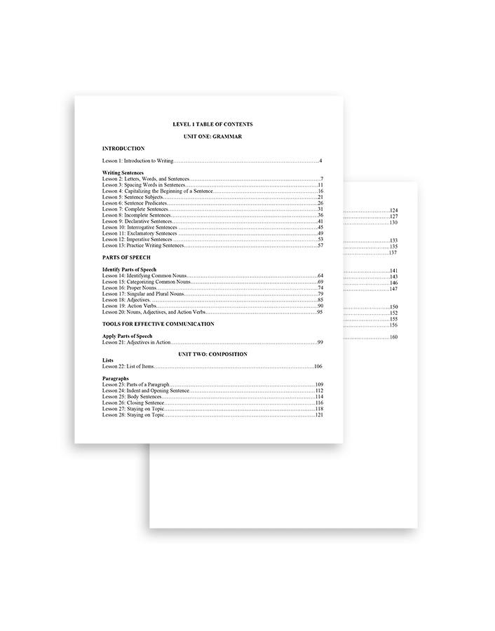 Students completing Level 1 Writing will learn and practice grammar and writing skills. This list is non-exhaustive but rather serves as a quick insight into the subjects that students will learn – writing sentences, identifying parts of speech, applying parts of speech, writing lists, paragraphs, personal letters, personal narratives, imaginative narratives.